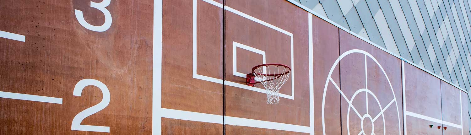 En annan arbetsmiljöaspekt är akustiken och hallen uppnår ljudklass A, som motsvarar mycket goda ljudförhållanden. Lärarrummet har fönster, ett mot gården och ett in i korridoren. Den lutande tillgänglighetsrampen mellan entré och idrottshall har målats som två löparbanor och blir ett perfekt verktyg för uppvärmningen. I stället för dörrar används rullportar i stor utsträckning. Så där fortsätter det i detalj efter detalj. Allt är genomtänkt.